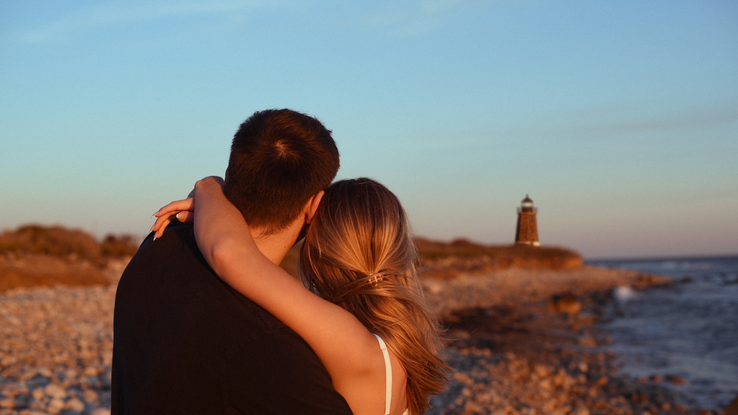 A happy couple enjoying a romantic moment outdoors during sunset, sharing glasses of champagne and smiling at each other.